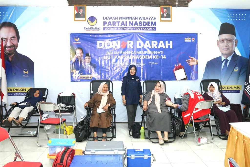 DPW Partai NasDem Daerah Istimewa Yogyakarta menggelar donor darah dan pemeriksaan kesehatan gratis dalam rangkaian HUT Partai NasDem ke-14. Acara digelar di Kantor DPW NasDem DIY, Jl. Kenari, Demangan Baru, Caturtunggal, Depok, Sleman, Minggu 26 Oktober 2025.